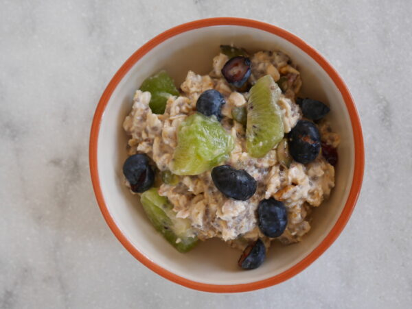 En nem og anderledes morgenmad. Retten kræver lidt planlægning, da den skal tilberedes om aftenen og spises kold næste morgen. Kan også spises som et mættende og friskt mellemmåltid. Kan tilberedes med alle former for frugt/bær.