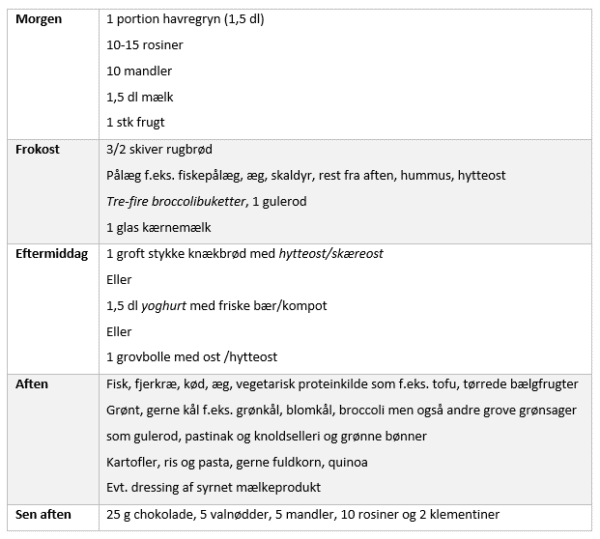 Følgende forslag indeholder både fibre og kalk. I forslaget er der i alt 27-35 g fibre afhængig af mængden og typen af grøntsager og frugt. Der er ca. 1000 mg kalk i nedenstående forslag. Det afhænger i høj grad af, hvor meget mælkeprodukt og grønkål samt grøntsager, der indtages.