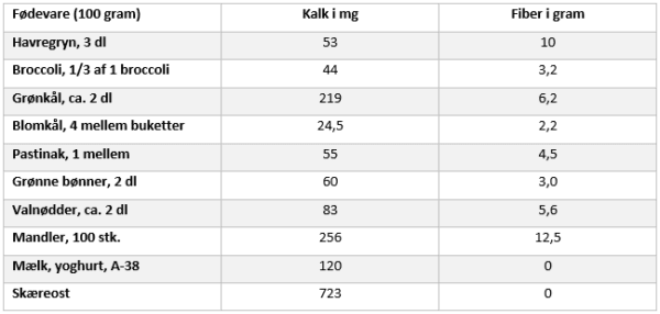 Skal vi så regne på kalk og fibre hver eneste dag? Det kan være en god ide i starten, men ikke hver dag. Hvis du spiser broccoli og grønkål hver dag, og kun af hensyn til fiber-og kalkindholdet, risikerer du at blive træt af smagen. Spis varieret er et vigtigt råd, også for livskvaliteten. Nedenstående er en oversigt over udvalgte fødevarer, der indeholder fibre (dog ikke mælkeprodukter), og kalk. Formålet med oversigten er således at give information om nogle gode og fiberrige fødevarer, som også har et godt eller nogenlunde indhold af kalk. Bemærk, at der ikke er mange fødevarer, der indeholder netop denne kombination. ”Vinderen” er grønkål, så brug gerne denne fødevare i suppe, puré, salater, smoothies og endelig den klassiske model, nemlig stuvet grønlangkål.