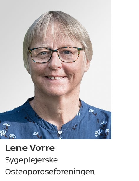 Er du ny med knogleskørhed? Eller har du brug for et godt råd til hvad du selv kan gøre, eller hvem der kan hjælpe dig videre? Så kan du ringe til sygeplejerske Lene Vorre. Lene, der rådgiver om: